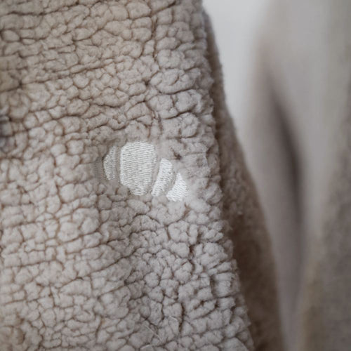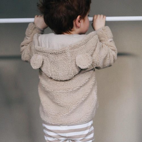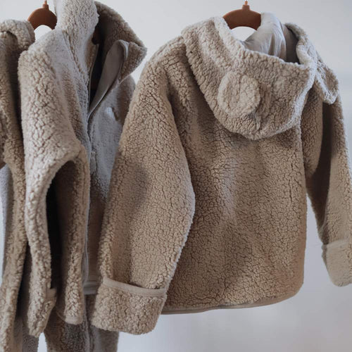Die PELUCHE Teddyjacke ist eine Jacke aus Teddystoff mit Kapuze und Ohren.