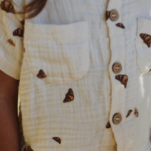 Die Pyjama hat einen Rundhalsausschnitt mit Holzknöpfen an der Vorderseite und praktische Brusttaschen.